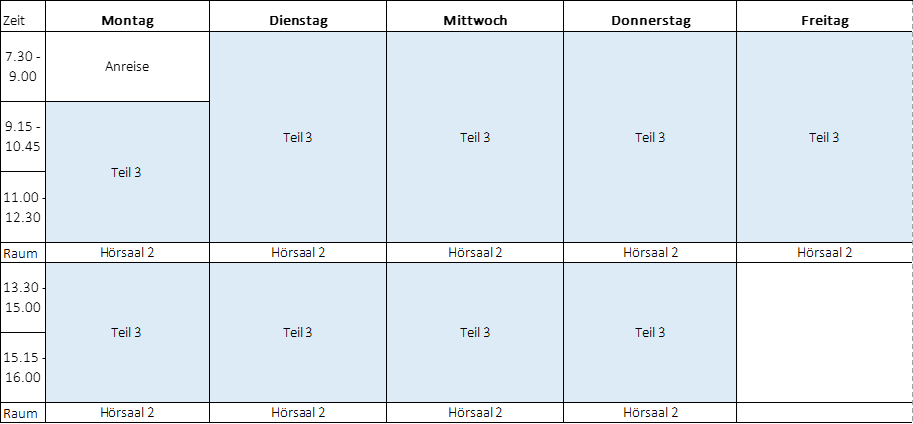 Wochen 8 bis 11 werden in Vollzeitblöcken unterrichtet (Teil 4 abgeschlossen, Teil 3 Montag bis Freitag)