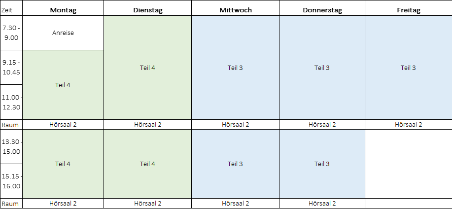 Die ersten 7 Wochen werden in Teilzeitblöcken unterrichtet (Montags und Dienstags Teil 4 / Mittwochs bis Freitags Teil 3)