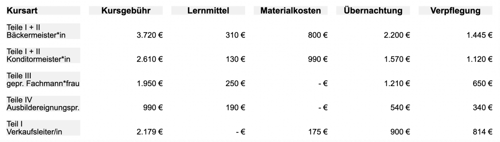 Hinweis: Bitte beachten Sie, dass die Preise bei Buchungen von Meisterlehrgängen für das Jahr 2026 angepasst werden können. Wir versuchen die Gebühren und Kosten stabil zu halten, können in der aktuellen Situation Preisanpassungen aber nicht ausschließen!
